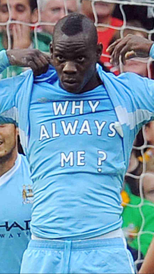 Why Always Me? Is a phrase we have ALL used, and really means “why does bad stuff always seem to happen to me?” Granted Balotelli was wearing it as an ironic gesture for his critics to eat their words as he slotted the ball in the back of the net (or not!!).